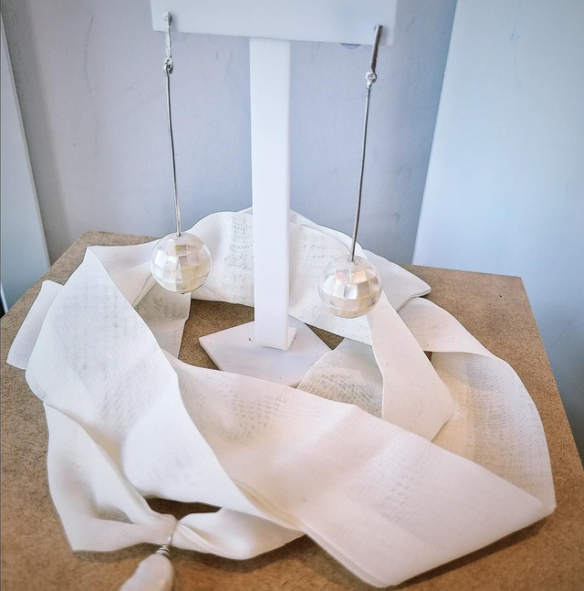 Brinco pendente com uma esfera de mosaico de madrepérola e prata fina 950.